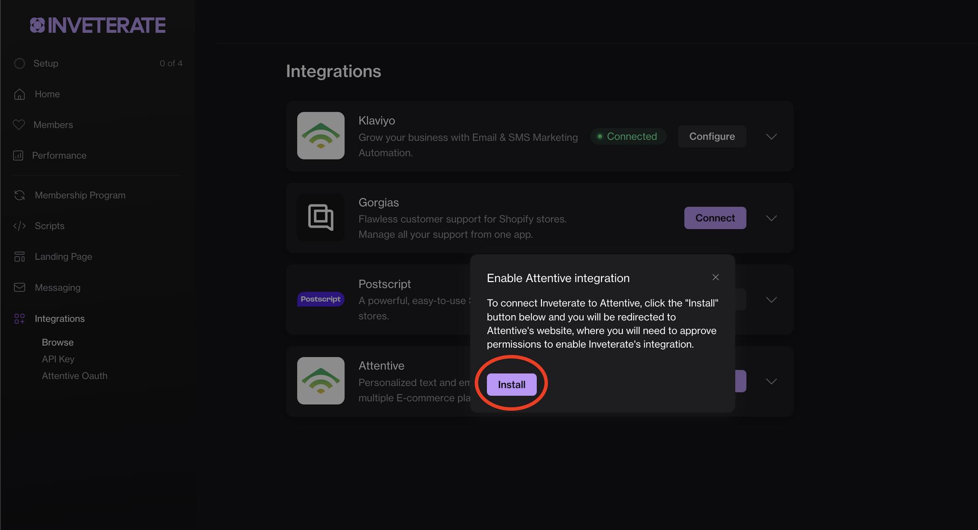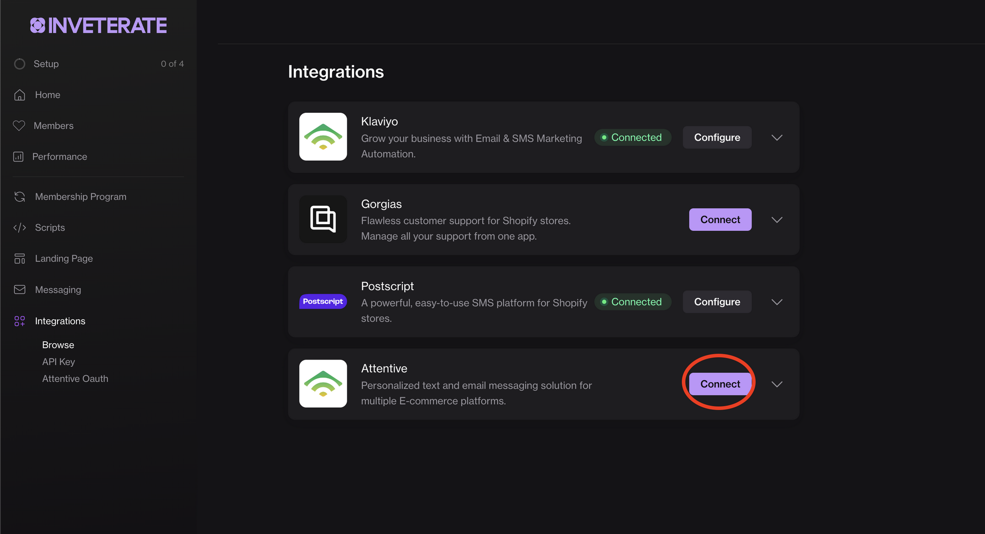 1. On your Inveterate merchant dashboard's "Integrations" page, click the "Connect" button within the Attentive block.<br>