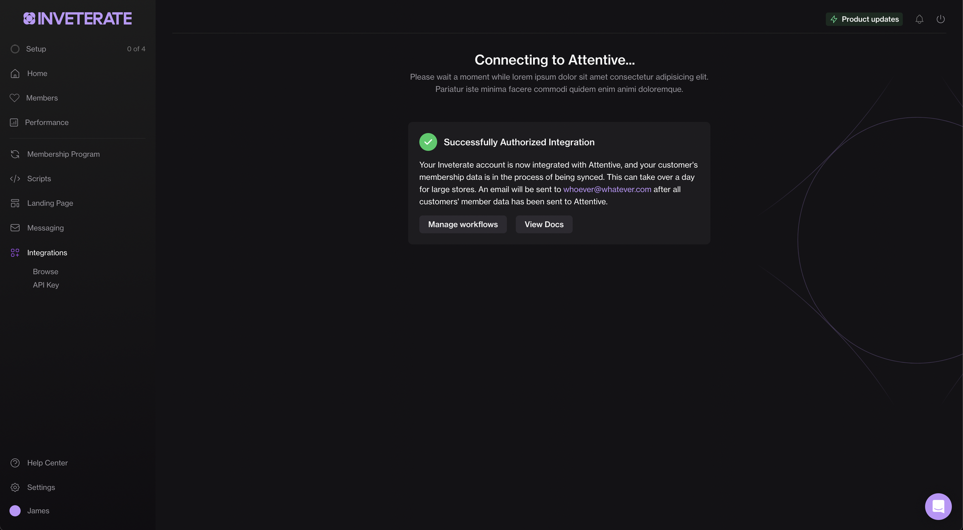 4. After clicking "Authorize", you will be redirected back to a loading page on the merchant-dashboard while we finish getting permissions for Inveterate to access your Attentive account. If it is successful, you will see this screen: