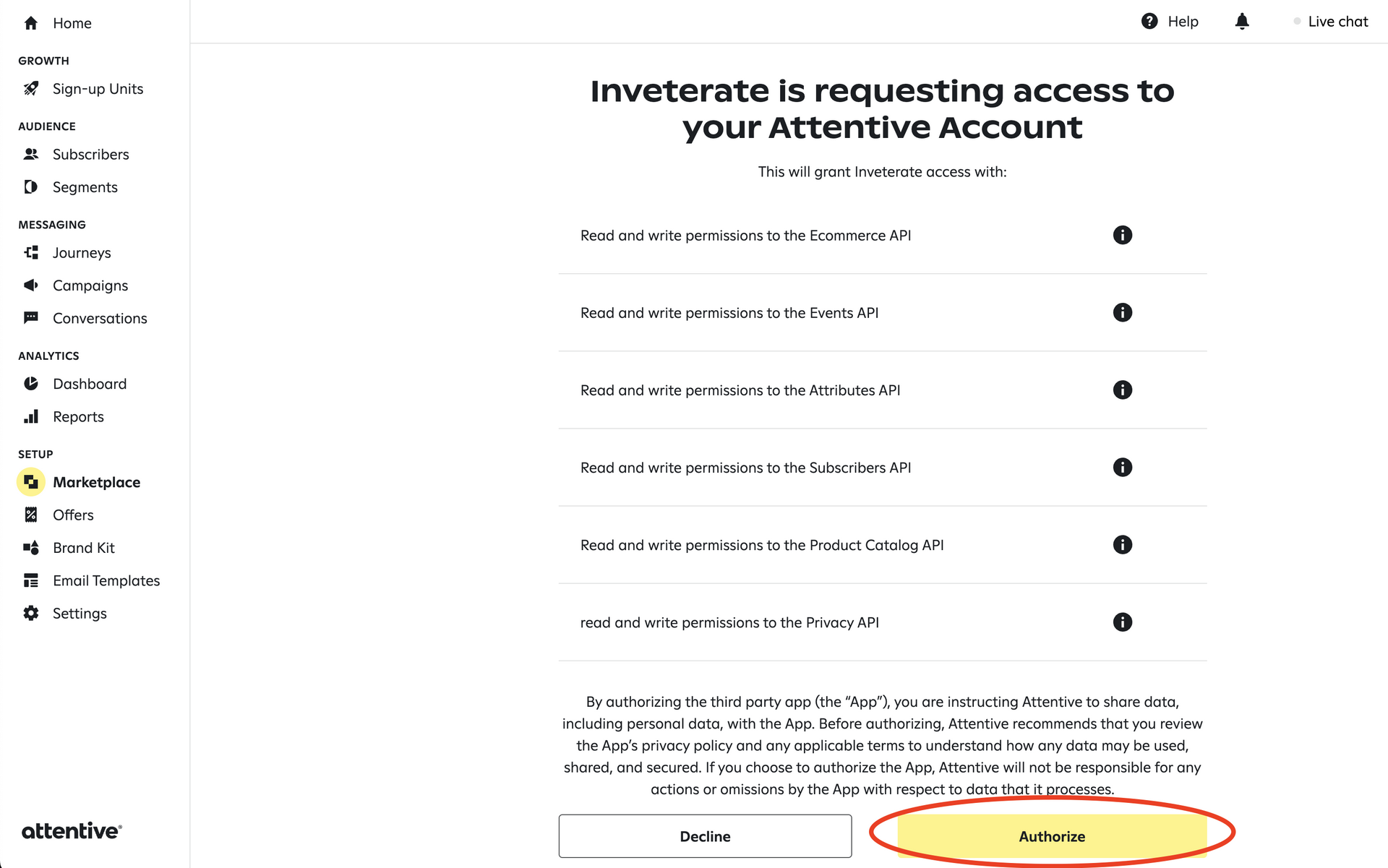3. Clicking the "Install" link will redirect you to Attentive's website, where you will need to click the "Authorize" button to grant Inveterate permissions to use Attentive's APIs to sync membership data and events.